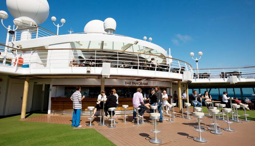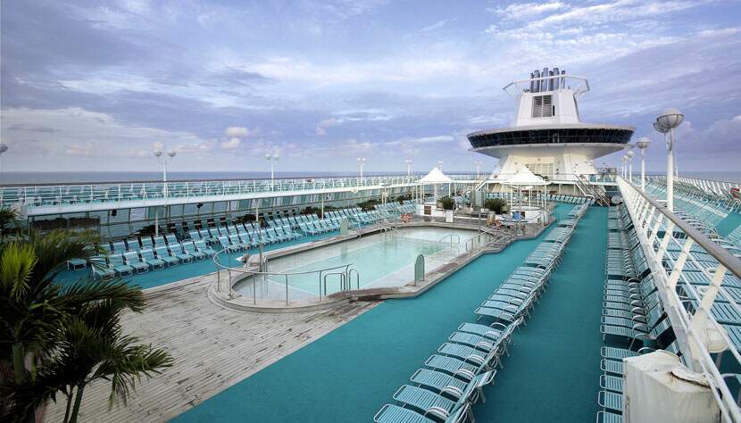 MS Zaandam (Holland America Line): O deque com duas piscinas e o cinema sempre abastecido de pipoca diz muito sobre o astral do navio, cuja decoração tem guitarras assinadas por David Bowie e Keith Richards, assim como um saxofone autografado por Bill Clinton.
